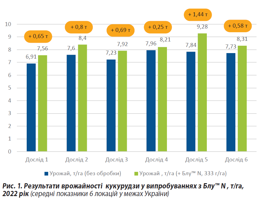 У 2022 році були проведені дослідження біопрепарату Блу™ N в посівах кукурудзи у різних регіонах України (рис.1). Прибавка врожайності на ділянках, де використовувався оптимізатор живлення, сягала від 0,3 до 1,5 т/га порівняно з контролем (без застосування Блу™ N).