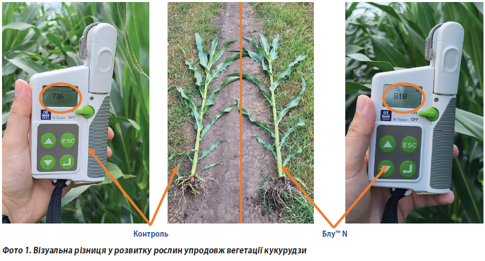 Зазвичай візуальний ефект від застосування продукту протягом вегетації не помітний, але на деяких локаціях спостерігався так званий green effect (рослини були зеленіші та вищі), а також кращий розвиток кореневої системи. Показники N-тестера були вищими на ділянках, де вносився Блу™ N (фото 1).