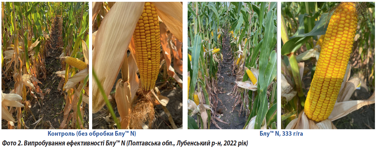 У пізніші фази вегетації, коли качани були сформовані, відзначалася різниця у розвитку генеративних органів (лише на кількох локаціях). Так, на момент спостереження (7.09.2022) у дослідах, що були закладені у Полтавській області, на контролі майже всі обгортки качанів були сухими, а на ділянці, де вносили Блу™ N, більшість обгорток мали зелене забарвлення. Також порахували кількість рядів і зерен у ряді на обох ділянках на 38 продуктивних рослинах/качанах. Середня кількість зерен у качані на контролі сягала 546 штук, а у варіанті з Блу™ N — 610. Крім того, на контролі у більшості качанів верхівка була виповнена не повністю порівняно з ділянкою, де використовували Блу™ N (фото 2).