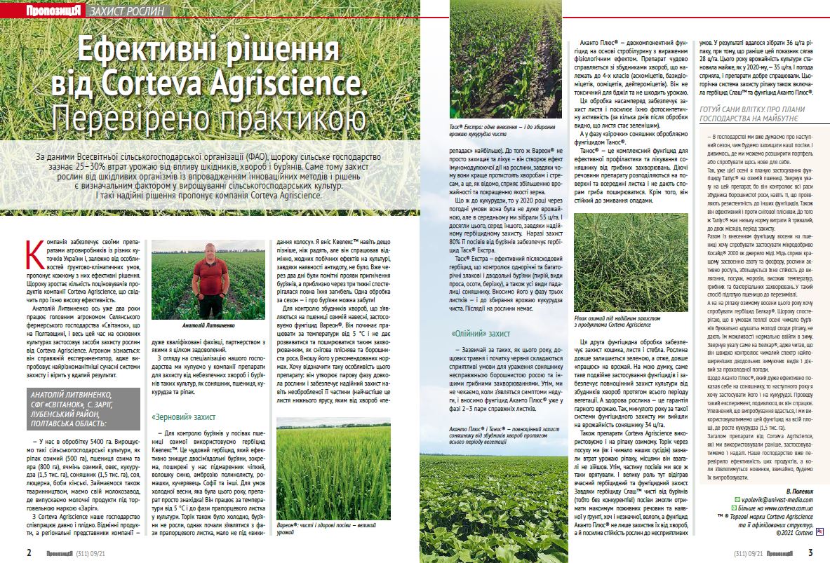 Анатолій Литвиненко, головний агроном Селянського фермерського господарства «Світанок», що на Полтавщині, дуже задоволений співпрацею з компанією. У господарстві він працює два роки і весь цей час на основних культурах застосовує засоби захисту рослин від Corteva Agriscience. Агроном зізнається: він справжній експериментатор, адже випробовує найрізноманітніші сучасні системи захисту і вірить у вдалий результат.