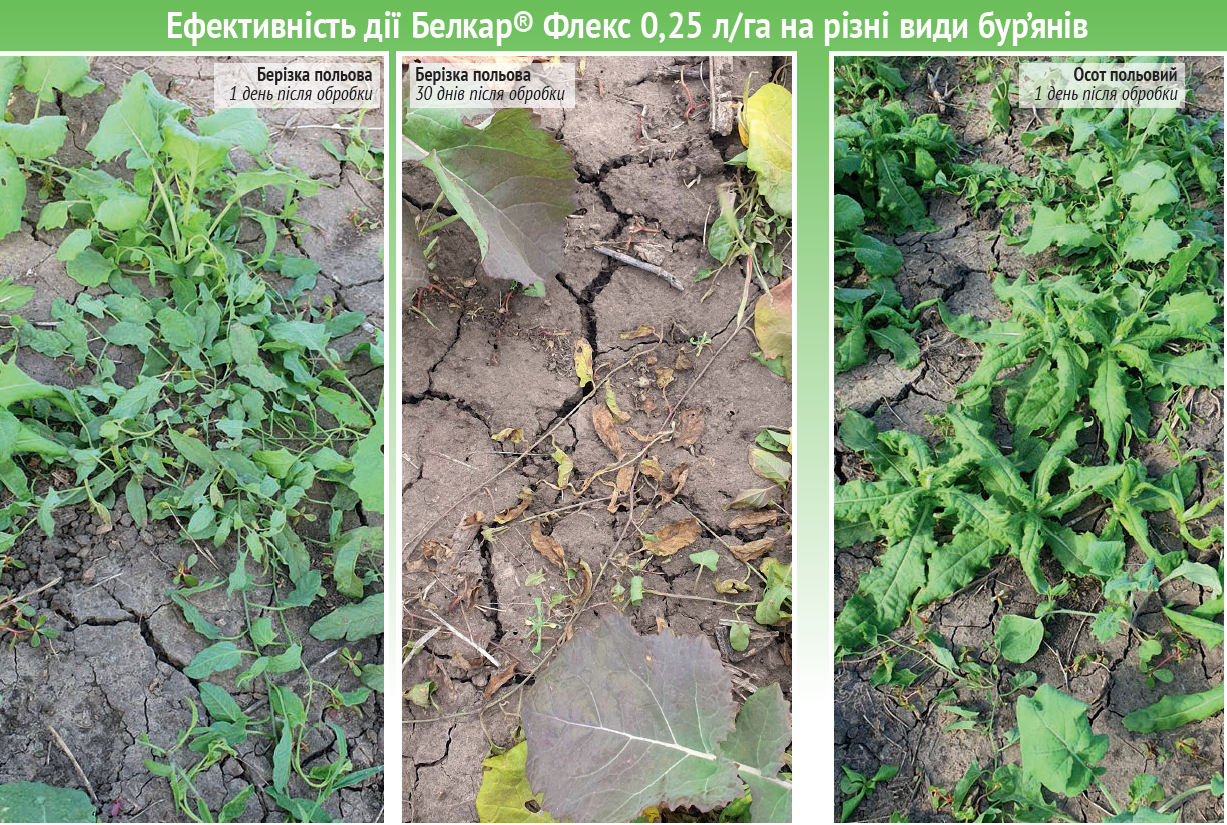 Гербіцид Белкар® Флекс завдяки унікальному поєднанню діючих речовин (галауксифен-метил, 10 г/л (Arylex™ active) + піклорам, 48 г/л + амінопіралід, 32 г/л) з нормою внесення 0,25 л/га, при застосуванні в осінній період вегетації ріпаку озимого від фази 2-х листків (ВВСН 12) до фази 8-ми листків (ВВСН 18), забезпечує високоефективний контроль широкого спектра ключових і проблемних зимуючих (підмаренника чіпкого, маку дикого, видів герані, видів кропиви глухої, жабрію звичайного, видів ромашки, рутки лікарської, роману польового, портулаку городнього), капустяних (грициків звичайних, кучерявцю Софії, талабану польового – якщо на момент обробки вони перебувають на ранніх фазах росту і розвитку (сім’ядолі – 4 листки)), однорічних дводольних (лободи білої, амброзії полинолистої, видів гірчаків і падалиці соняшнику всіх типів (за оптимальної фази розвитку падалиці на момент обробки 2–4 справжніх листки)) бурʼянів, а також має посилену ефективність проти осоту рожевого та берізки польової.