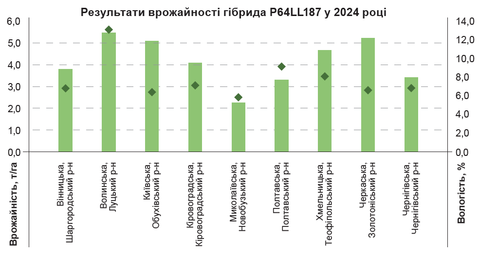 P64LL187 – новий високопродуктивний середньостиглий гібрид для класичної технології, що має потужний потенціал урожайності і відмінний рівень олійності, помірно інтенсивний, здатний показувати високий результат як в умовах посухи, так і за інтенсивної технології з нормальним зволоженням. Гібрид максимально захищений від вовчка двома стійкостями (Or7 + горизонтальна – System II), а також від хвороб високим рівнем толерантності до більшості з них.