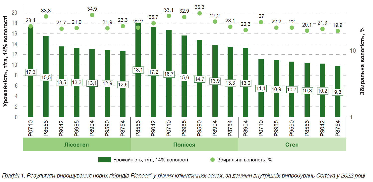Насамкінець хотілося б наголосити, що насіннєвий бренд Pioneer® компанії Corteva Agriscience – перевірений часом бренд із потужною історією. З огляду на високу вартість просушування, дорогу логістику, зміну клімату та інші виклики, які ставить перед аграріями сьогодення, ми оновили портфель кукурудзи 2023 року, збагативши його ранньостиглими Р8754 (ФАО 240) та Р8556 (ФАО 250), середньораннім Р8904 (ФАО 280), середньостиглими Р9042 (ФАО 310) та Р9590 (ФАО 340), середньопізнім Р9985 (ФАО 370) та пізньостиглим Р0710 (ФАО 530). Майже всі гібриди можна вирощувати без обмежень: у зонах Полісся, Лісостепу та Степу. Також серед новинок є інтенсивні гібриди лінійки Optimum® AQUAmax® (Р8754, Р9958, Р0710), гнучкий інтенсивний гібрид цієї ж лінійки Р8904, адаптивні Р8556 та Р9042 і гібрид для виробництва крупи Р9590. Різні групи стиглості та інтенсивність гібридів дають аграріям змогу обрати насіння для конкретних умов господарювання. Компанія Corteva Agriscience, крокуючи в ногу із часом, і надалі задовольнятиме потреби тих, хто виробляє сільськогосподарську продукцію, та тих, хто її споживає, прагнучи при цьому безпеки наступних поколінь.