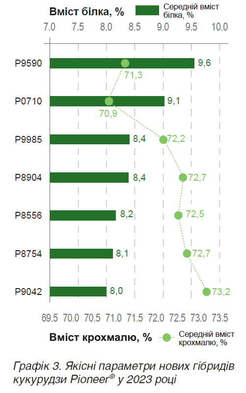 Залежно від мети використання насіння кукурудзи товаровиробники можуть зважати на якісні параметри зерна, зокрема, вміст білка, крохмалю тощо. На графіку 3 видно, що гібриди з вищим вмістом білка мають менше крохмалю і навпаки. Найвищий вміст білка зафіксований у Р9590, Р0710, Р9985, у той час як лідерами за вмістом крохмалю є Р9042, Р8754, Р8556. Оптимальний баланс притаманний Р8904.