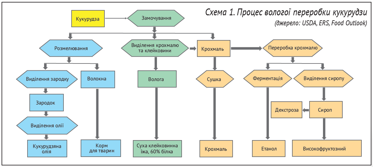 Волога переробка кукурудзи (схема 1), також відома як процес рафінування кукурудзи, була започаткована понад 150 років тому з метою виробництва крохмалю для прання. Така переробка передбачає розділення зернівки на крохмаль, білок (клейковину), зародок та волокна у водяному розчині. Крохмаль, який можна екстрагувати, а не просто вміст крохмалю в зерні, є ключовим чинником, що визначає цінність кукурудзи для крохмале-патокового виробництва.