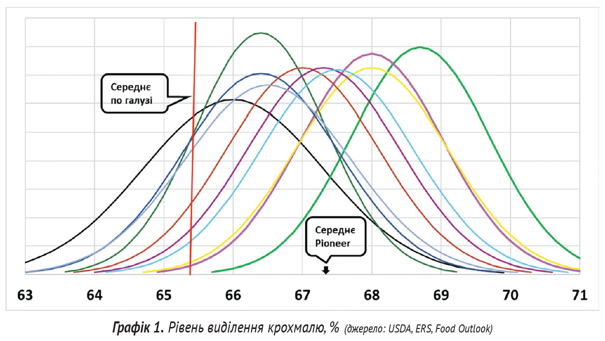 Дослідники Corteva фокусуються на кількості крохмалю, який можна отримати в результаті розкладання зерна, а не просто на вмісті крохмалю в зернині. Саме це є запорукою високих результатів у процесі вологої переробки восковидних гібридів Pioneer®. Гібриди кукурудзи суттєво варіюють за цією ознакою. Гібриди Pioneer®, призначені для крохмале-патокового виробництва, мають забезпечити вихід крохмалю на 2% вищий, ніж середні показники галузі (графік 1).