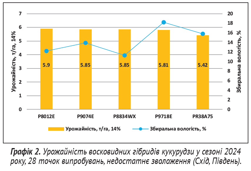 Як видно з графіка 2, усі восковидні гібриди Pioneer® в умовах нестачі опадів Східної та Південної України (менш ніж 100 мм за вегетацію) показали залікову врожайність на рівні понад 5 т/га. Такі результати мають гібриди зернового напряму, отже, вирощування правильно підібраних восковидних гібридів не нестиме ризиків зниження врожайності. Дані достовірні, адже всі 5 гібридів вирощувалися на 28 точках випробувань, розташованих на сході та півдні України.