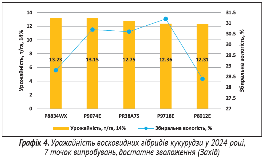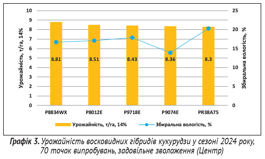 Графік 3 показує, що в умовах, коли протягом вегетаційного сезону випало приблизно 150 мм опадів, восковидні гібриди забезпечили більш як 8 т/га за стандартної вологості 14%. На перше місце виходить новий Р8834WX, однак Р8012Е дуже близький до лідера, попри свою ранньостиглість.