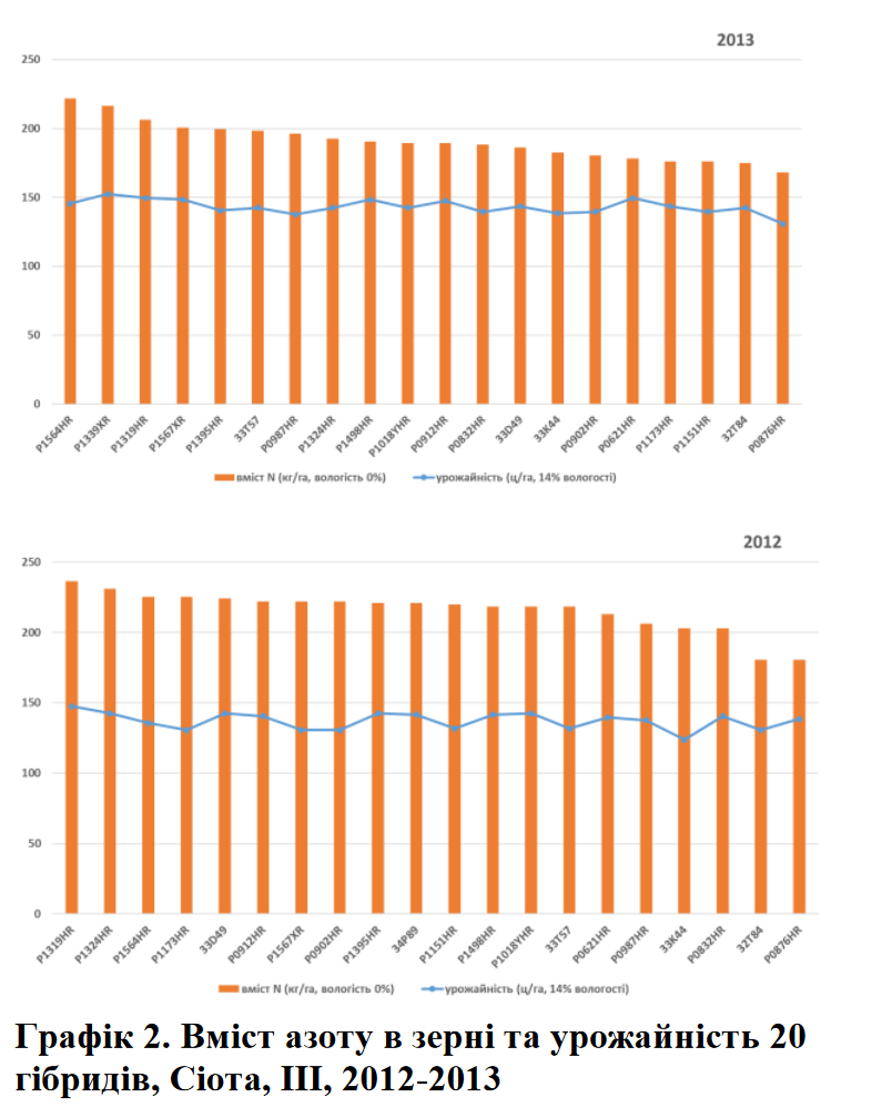Науковці Cortevaпроводять фундаментальні дослідження в сфері збільшення урожайності кукурудзи за рахунок підвищення ЕВА. Розробка чіткого розуміння потреб в азоті при інтенсивному та екстенсивному господарюванні в умовах різного азотного живлення є ключовим при вдосконаленні ЕВА. В межах цього дослідження 20 гібридів Pioneer оцінювалися при інтенсивному вирощуванні біля Сіоти, ІІІ, протягом 2012-2013 років. Метою досліду було визначення вмісту азоту в конкретних гібридах (графік 2).