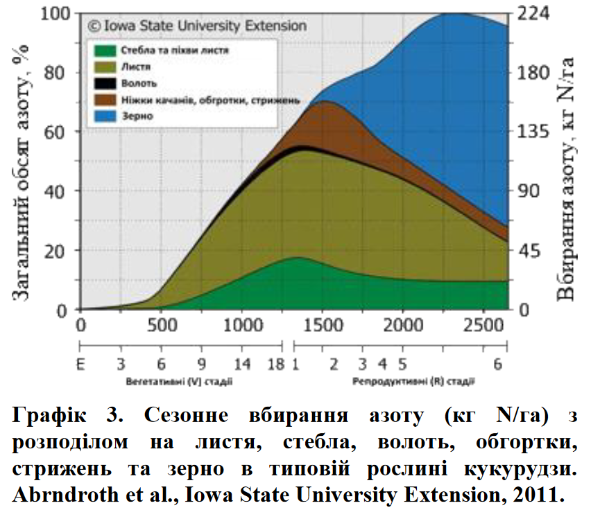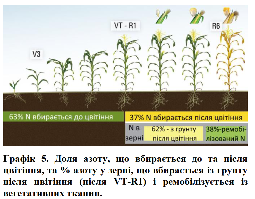 Декілька університетських досліджень оцінювали час вбирання азоту. В дослідженніДержавного Університету Айови приблизно 60% (135кгN/га) від загальної потреби в азоті (графік 3) було ввібрано і накопичено в листі, стеблах та початках на момент R1 (вихід шовку) в умовах сприятливих грунтово-кліматичних умов –рівень урожайності 140 ц/га (Abendroth et al., 2011). На момент фізіологічної стиглості (R6 –чорна точка) –загальний обсяг ввібраного азоту (вегетативні органи+зерно) досягав 213 кгN/га. Подальші розрахунки показують, що 80 кгN/га все ще повинні бути поглинуті після цвітіння для підтримки формування зерна.