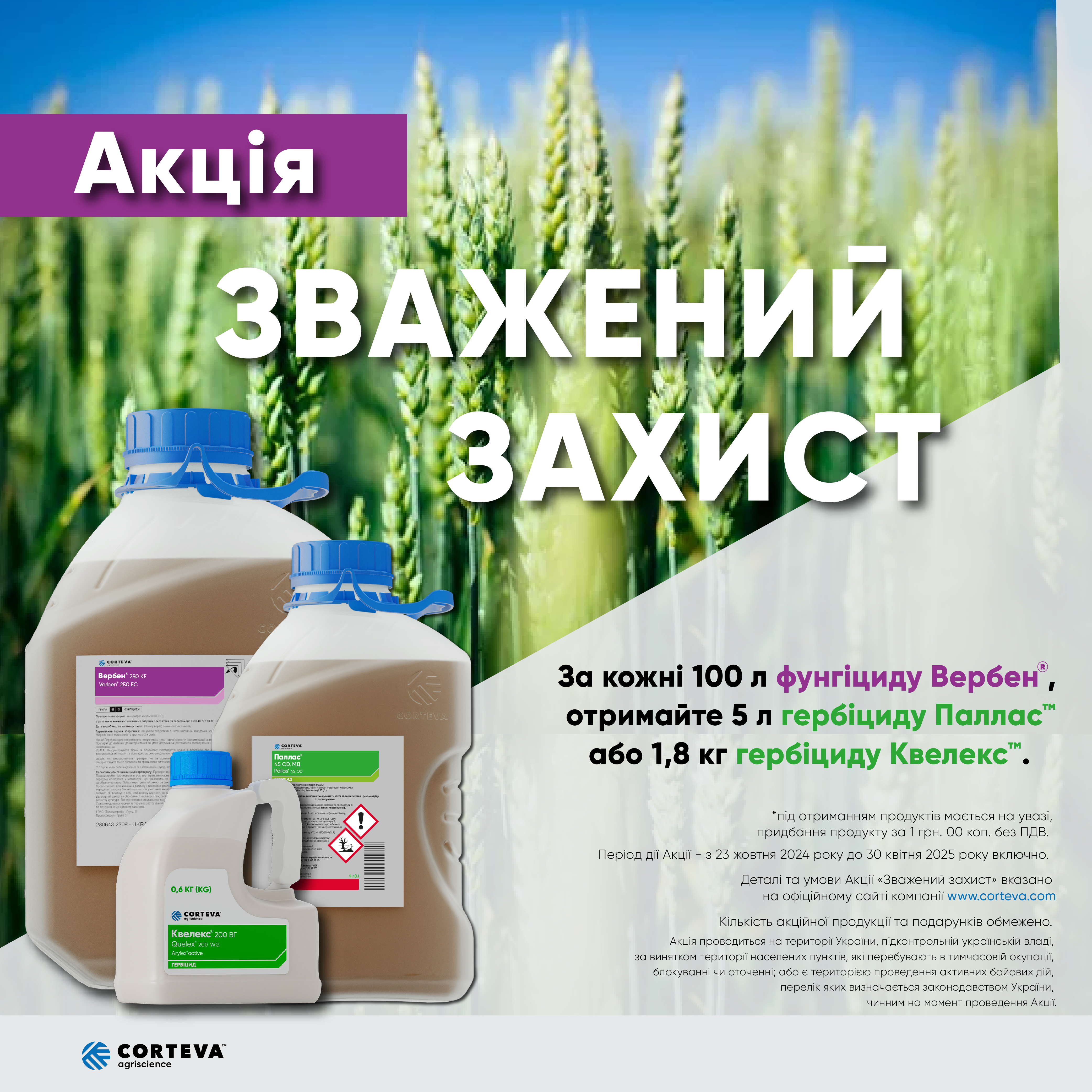 4.1 За придбану в обсязі згідно п. 1.4. Акційну продукцію Учасник має право отримати Винагороду згідно п. 1.5 цих Умов: гербіцид Палластм, в обсязі 5 л або гербіцид Квелекстм, в обсязі 1,8 кг за кожні придбані 100 л фунгіциду Вербен®.
