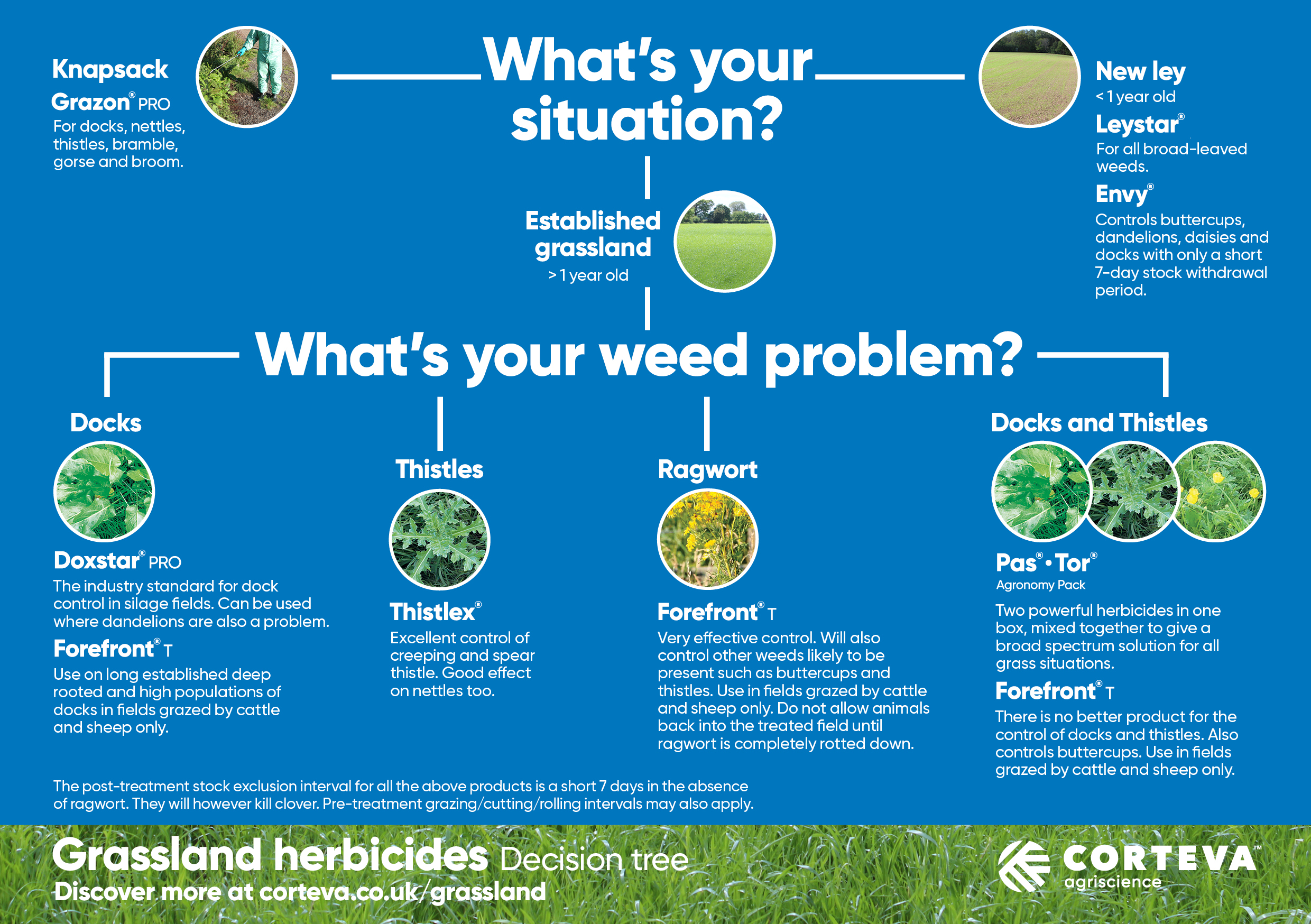 Many grassland herbicide products dictate grass should be ’established’, ie. over a year old at the time of treatment. But products are available for use in new sown grass leys applicable from as early as the three-leaf growth stage. The decision treein figure 2 can help determine the best product to use.