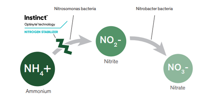 Instinct® is a nitrification inhibitor. It works by slowing down the conversion of ammonum into nitrate. Nitrate can be lost from soils and into the environment by leaching or greenhouse gases.