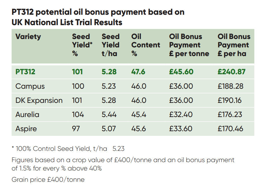 PT312 gave the highest oil content of any variety in 2020- 22 UK National List Trials. This level of oil content is likely to generate significant oil bonus payments. An illustration of the type of oil bonus payments that may be achieved can be seen in the table below: