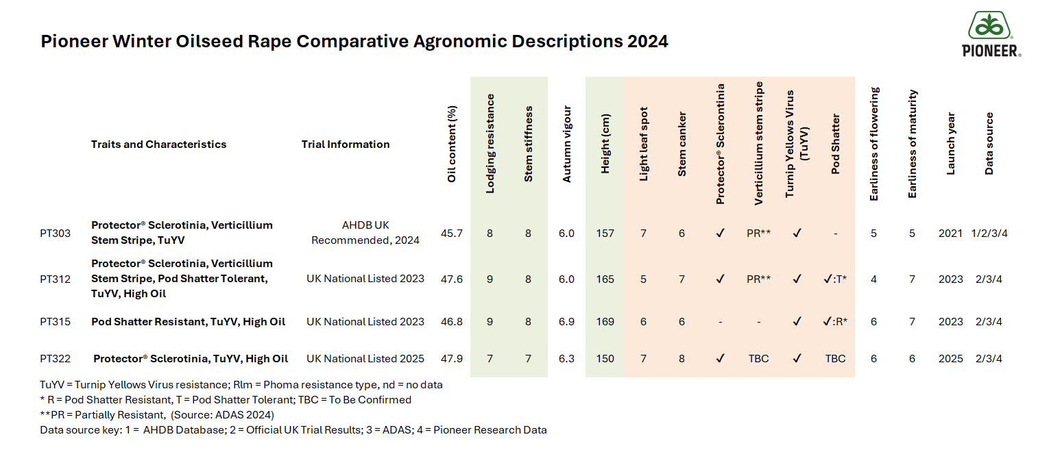 This top-level yield performance comes with a unique agronomic package including sclerotinia tolerance and turnip yellows virus resistance. PT322 has scored a 7 for stem canker resistance and an 8 for light leaf spot resistance, and has given an exceptionally high oil content of 47.9%.