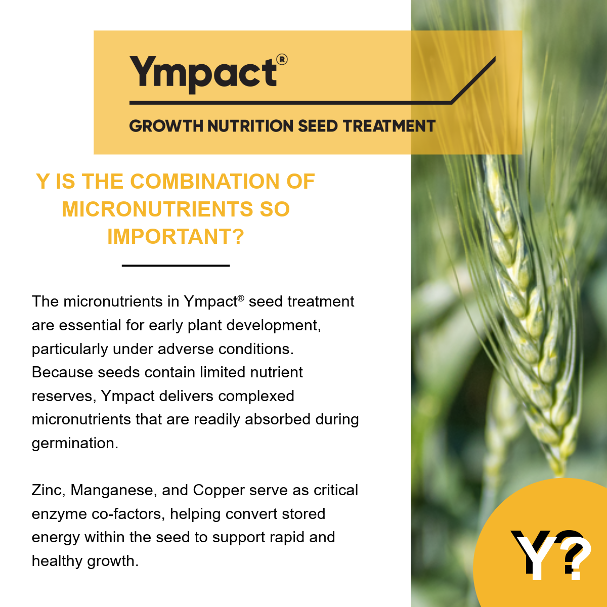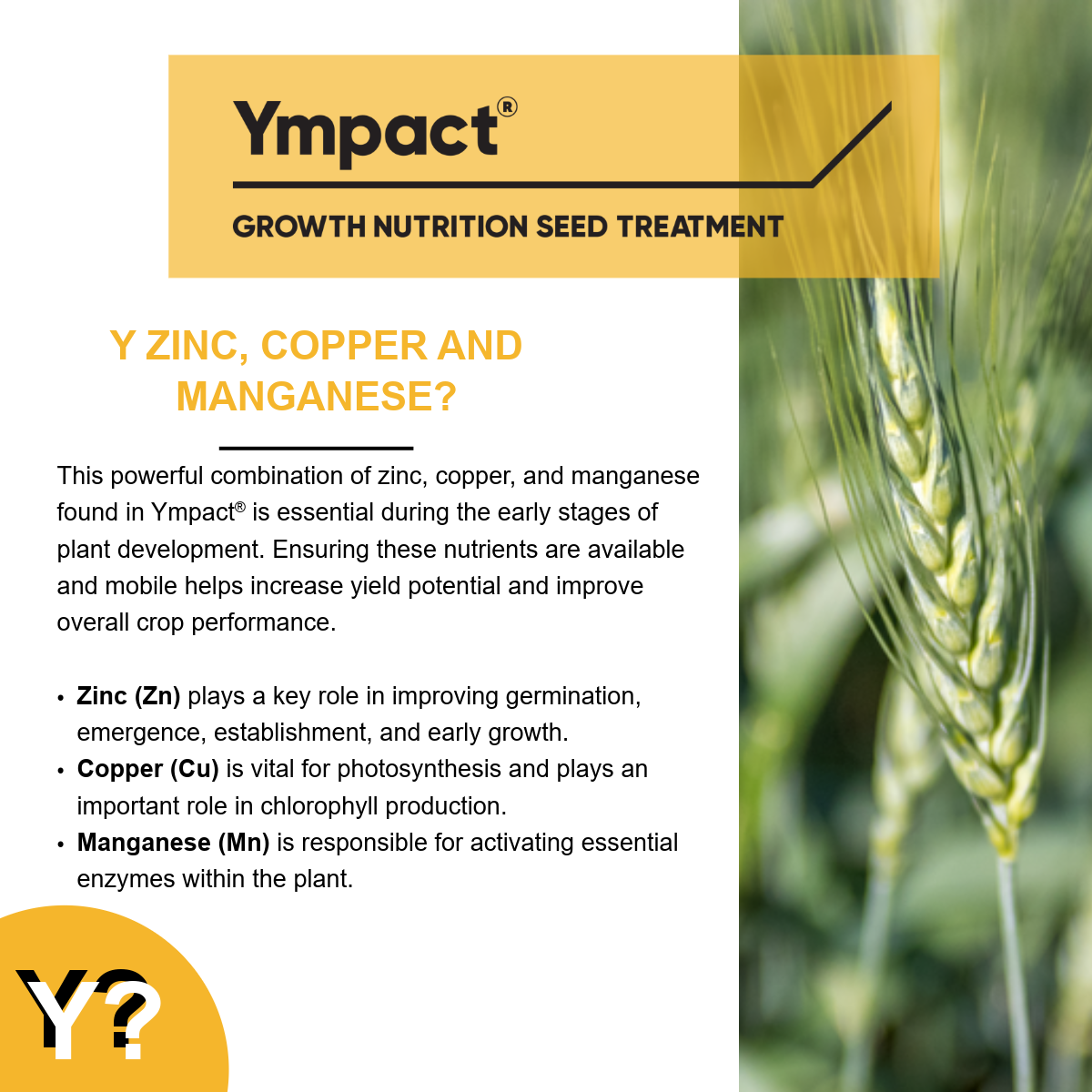 Zinc, copper, and manganese are crucial for driving early plant development — from germination to photosynthesis and enzyme activation. Ympact® ensures these vital micronutrients are available and mobile when crops need them most, helping to unlock higher yield potential and boost overall performance.
