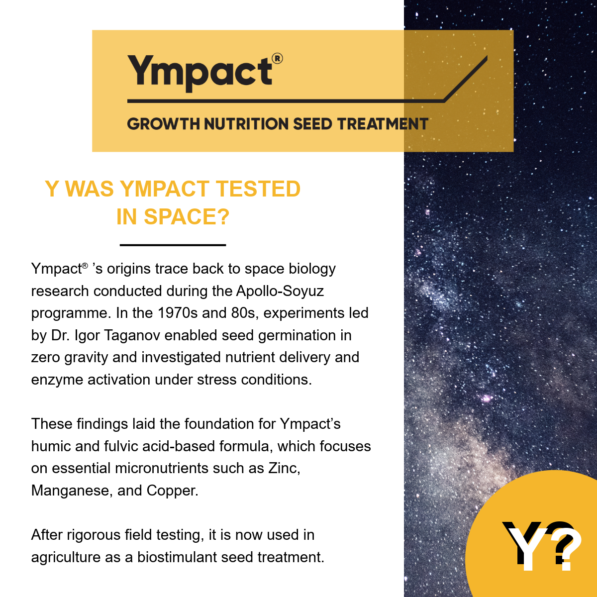 The science behind Ympact® has truly out-of-this-world origins. Rooted in space biology research from the Apollo–Soyuz programme, its development began with experiments exploring how seeds germinate and absorb nutrients in zero gravity. Those discoveries paved the way for Ympact’s advanced humic and fulvic acid formula — now helping crops thrive right here on Earth.