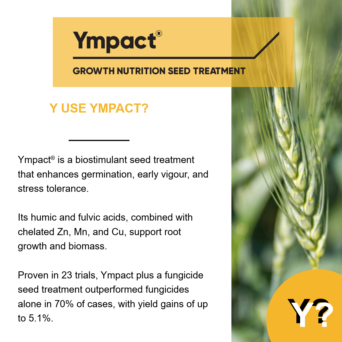 By enhancing germination, early vigour, and stress tolerance, Ympact® helps plants establish stronger and grow more resiliently. With humic and fulvic acids plus key micronutrients like zinc, manganese, and copper, Ympact® supports root development and boosts yield — proven in trials to deliver up to 5.1% yield gains when used alongside fungicide seed treatments.
