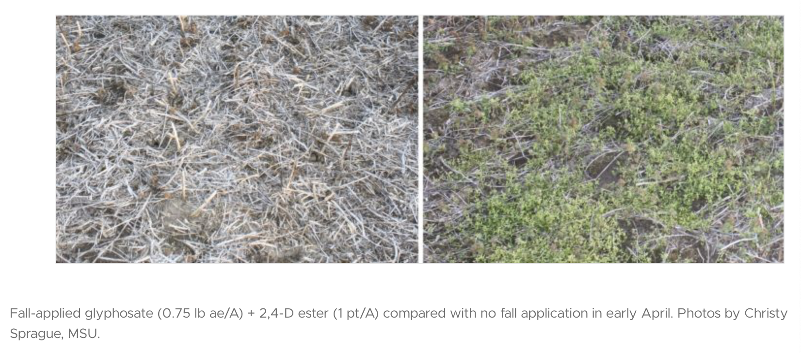 Depending on the weed species in the field, growers also use 2,4-D or dicamba to control emerged weeds. Atrazine can be a good option for growers planting corn in the spring. Check herbicide labels for fall recommendations, including rates, combinations, adjuvants and temperature ranges for applications.