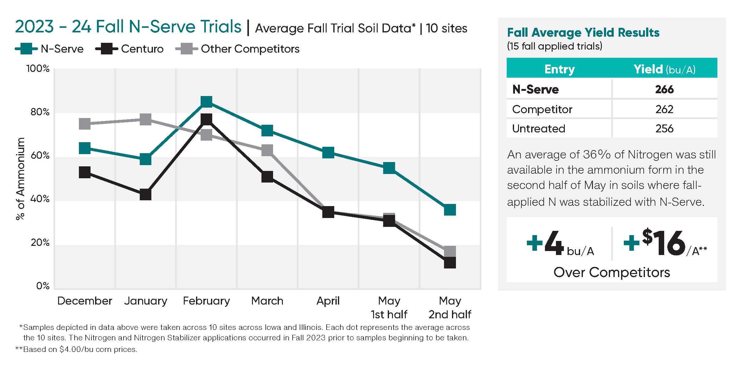 Throughout six months with higher-than-average rainfall across 10 trial locations, fall-applied nitrogen made with nitrapyrin — N-Serve nitrogen stabilizer — maintained a higher amount of nitrogen in the ammonium form compared with Centuro nitrification inhibitor and other competitors in similar conditions.