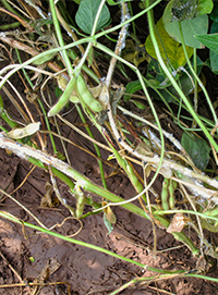 Soybean plants are most vulnerable to white mold infection during bloom phase. With adequate moisture, airborne spores that land on surrounding plants use senescing petals as the gateway to infecting the plant. Plant-to-plant infection is possible, but not common.