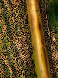 Tar spot is the physical manifestation of fungal fruiting bodies, the ascomata, developing on the leaf. The ascomata look like spots of tar, developing black oval or circular lesions on the corn leaf (Figure 1). The texture of the leaf becomes bumpy and uneven when the fruiting bodies are present. These black structures can densely cover the leaf and may resemble the pustules of rust fungi (Figure 1 and Figure 2). Tar spot spreads from the lowest leaves to the upper leaves, leaf sheathes, and eventually the husks of the developing ears.
