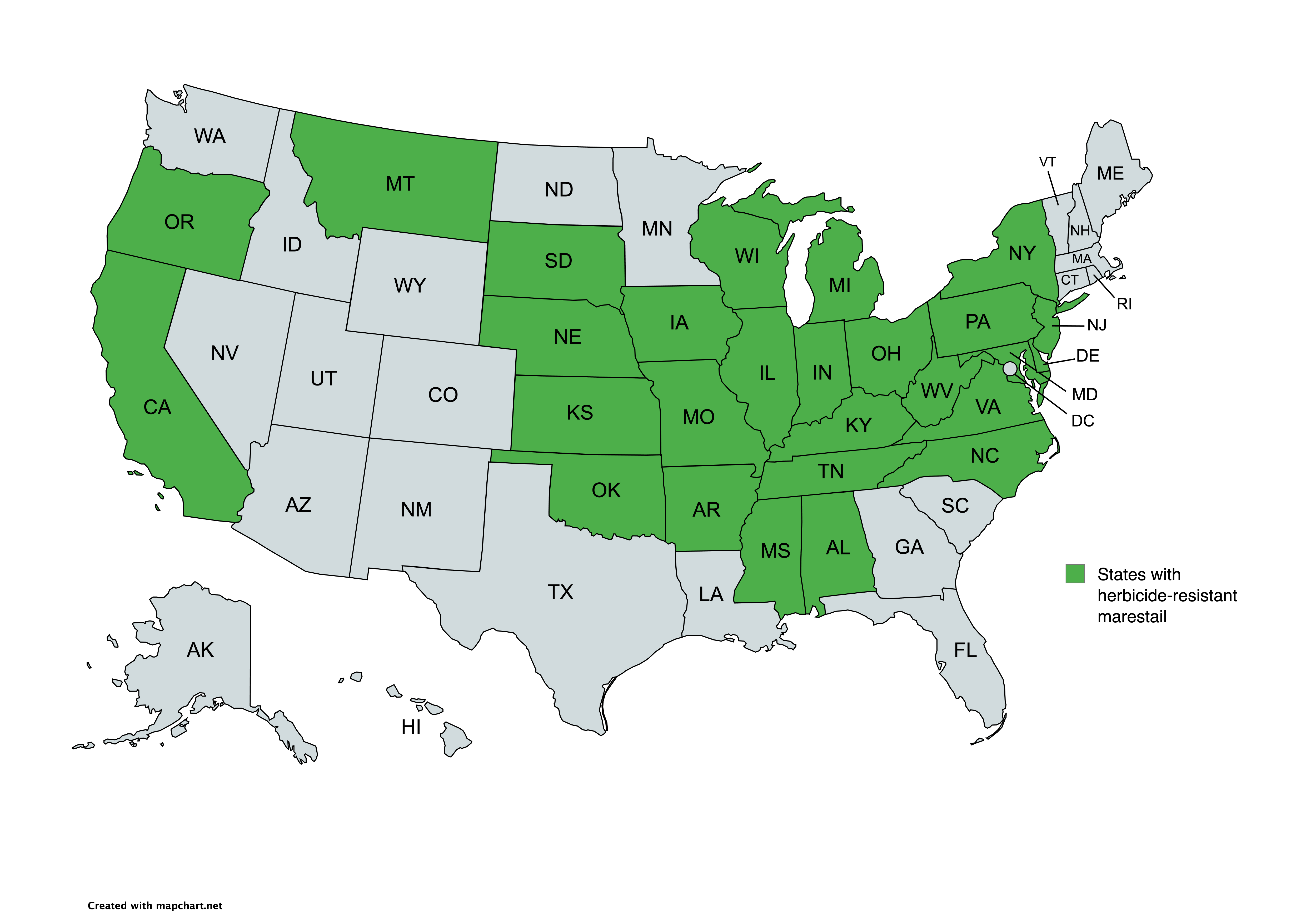 Since the first confirmation of glyphosate-resistant marestail in Delaware in 2000, resistance has spread to fields in 26 other states, including many of the key corn- and soybean-growing states across the Midwest. Farmers can get the most up-to-date information about weed resistance from the International Herbicide-Resistant Weed Database.