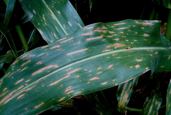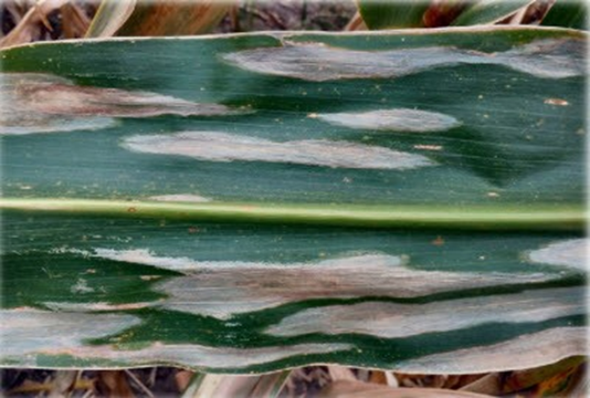 Symptoms: Black ovular or circular lesions on corn leaves that spread from the lower leaves to the upper leaves, leaf sheathes and eventually husks of developing corn ears.
