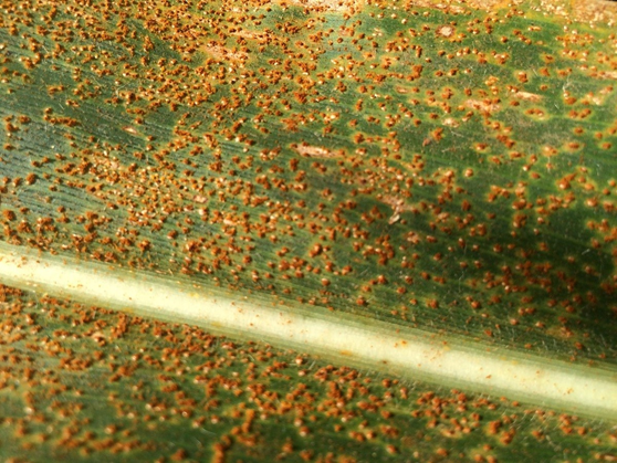 Symptoms: Lesions that begin as flecks on leaves and develop into small tan spots. Spots turn into elongated brick-red to cinnamon-brown pustules with a jagged appearance. Symptoms of common rust are found on both upper and lower leaf surfaces (unlike southern rust, where symptoms only appear on upper leaf surfaces).