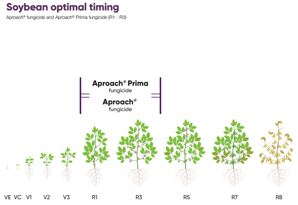 Aproach® and Aproach® Prima fungicides are two powerful choices to combat corn and soybean diseases. Both solutions are labeled for all the diseases listed above, with one exception: Aproach is labeled for control of white mold, while Aproach Prima is not. The following graphics show application guidelines for Aproach and Aproach Prima for corn and soybeans.