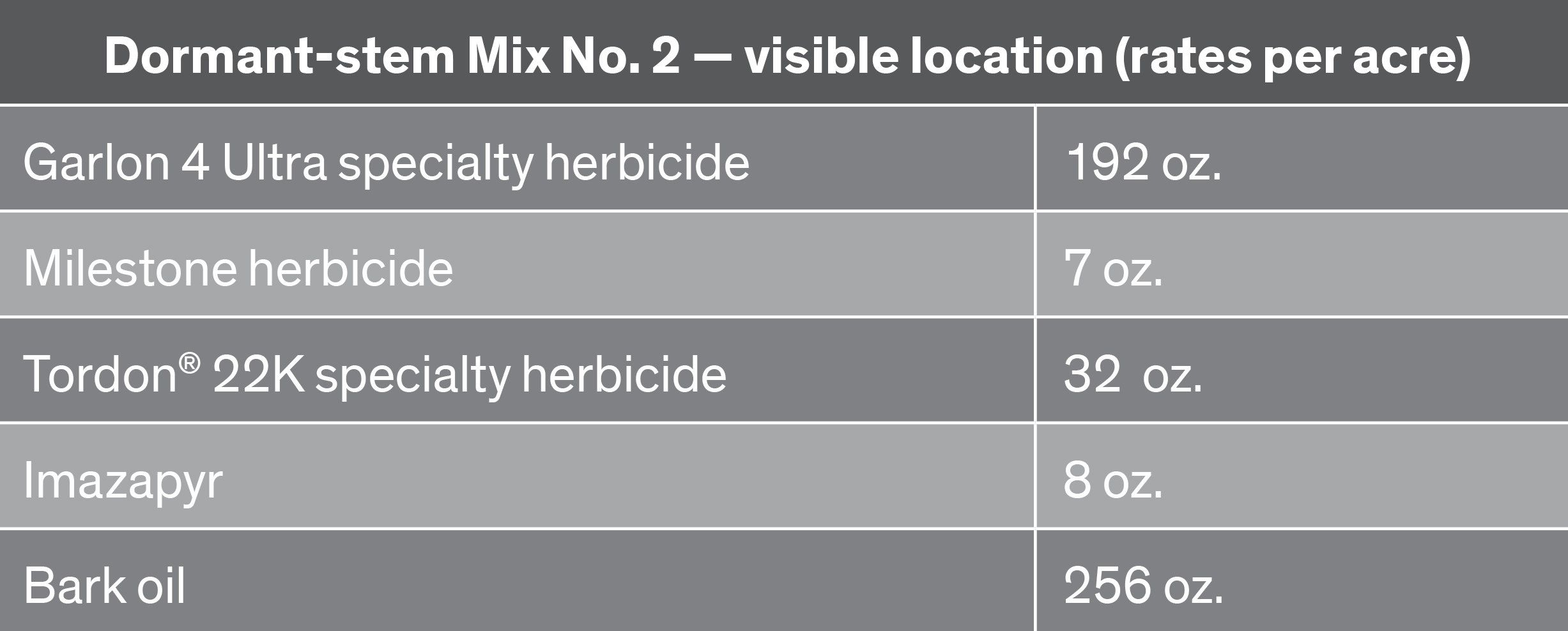 Each location had its own herbicide mix. The remote right-of-way mix was Garlon® 4 Ultra specialty herbicide, Milestone® herbicide, imazapyr and bark oil. The more visible location added Tordon® 22K specialty herbicide but lowered the rate of imazapyr. The team applied both mixes by using hydraulic sprayers. Exact rates are listed in the charts below: