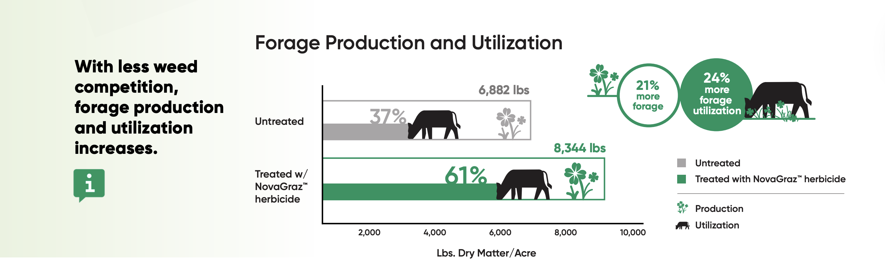 - Greater forage production and utilization. Broadleaf weeds in pastures typically reduce forage production by 1 to 1.5 pounds for every pound of weeds that grow during the season. Years of testing shows that using NovaGraz allows for broad-spectrum control of more than 20 of the most common broadleaf weeds, including ironweed, cocklebur, wild carrot, buttercup, biennial thistles, ragweed, plantain, woolly croton, poison hemlock and more. By eliminating weedy competition in cool-season grass and white clover pastures, NovaGraz improves both forage yield and utilization.