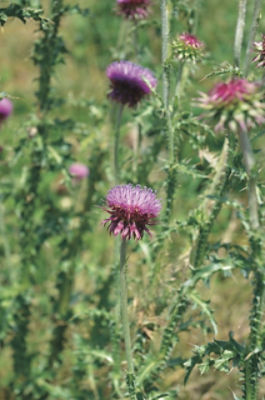 Thistles come in many different species and take the top spot in the most aggravating weed families category. Of the four main types that are most concerning for U.S. cattle producers, musk, bull, and Scotch thistles are biennials, while Canada thistle is a hardy perennial. Thistles can be easily recognized by their spiny leaves and round, purple or pink flowers, which resemble pincushions. Thistles not only compete with forage grasses for moisture and nutrients, they also reduce available grazing acres, as cattle avoid these thorny weeds.