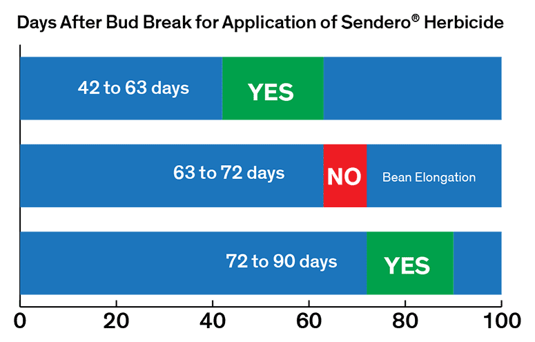 To control mesquite with Sendero, or any herbicide, soil temperature should be at least 75 F. Avoid treating in low humidity, during drought stress or after a big rain following a dry period. Avoid spraying during active bean elongation of mesquite trees.